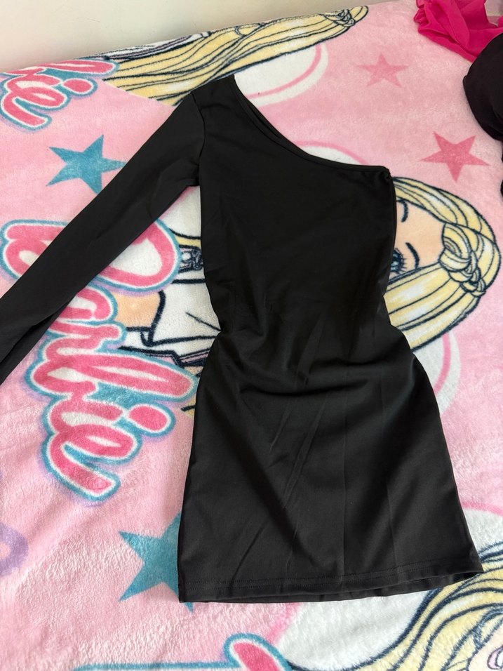 Tek kollu, drapeli detaylı, straplez yaka ve fitted kesim siyah midi elbise. Romantik akşamlar için uygun.