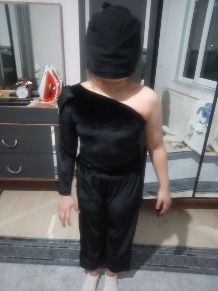 Siyah, tek kollu ve drapeli tasarıma sahip, yüksek yakalı, gotik tarzda çocuk kostümü. Fıt kesim ve desensiz, şık görünümlü.