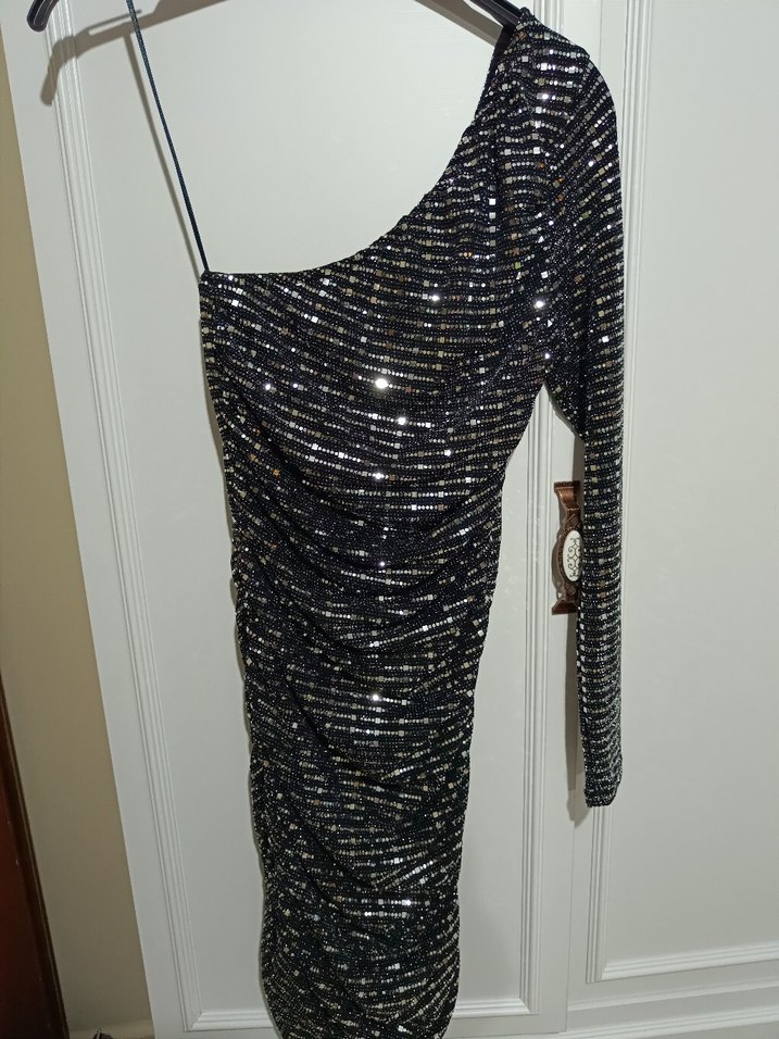 Tek Kollu Siyah Payetli Abiye Elbise