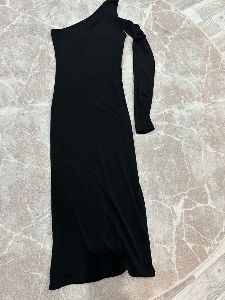 Tek kollu, straplez yaka ve drapeli tasarıma sahip siyah uzun elbise. Minimalist goth tarzında, ince ve şık kesimiyle romantik akşamlar için uygun.