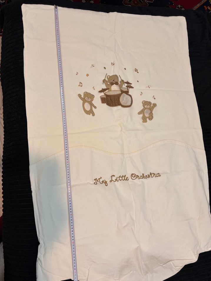 Yumuşak sentetik kumaştan yapılmış, baskılı ayıcık orkestrası desenli, açık bej renk çocuk uyku örtüsü. "My Little Orchestra" nakışı bulunur.