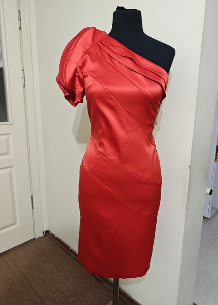Tek omuz saten midi boy elbise sıfır ürün etiketi üzerinde sadece kol koltuk altında minik bir lekesi var fotoğrafta görünmekte etikette XL yazmakta fakat kalıbı biraz dar olduğu için L-Xl beden aralığı için uygundr