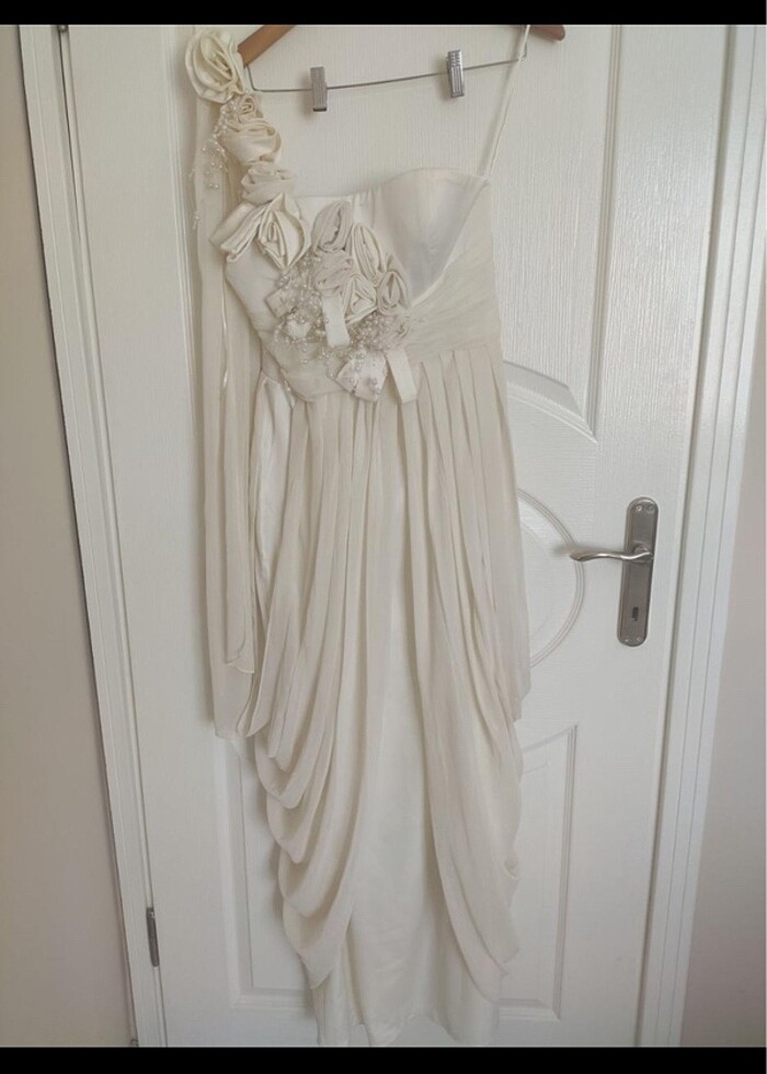1-2 kez giyildi. Tek omuz askılı 40/42 beden kırık beyaz elbise. boy 120 cm göğüs 40 cm