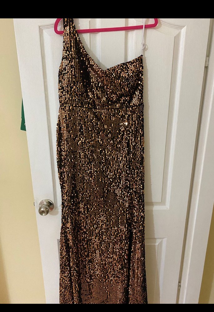 Bakır renk tek omuz payetli uzun abiye, şık ve fit kesimiyle partiler için uygun.