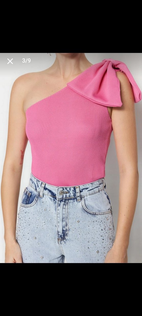 Tek omuzlu, fiyonklu pembe triko bluz, rahat ve şık sokak stili için uygun. Yumuşak dokulu, dar kesim ve kısa boyutlu. Hiç giymedim hamile kaldığım için olmadı .