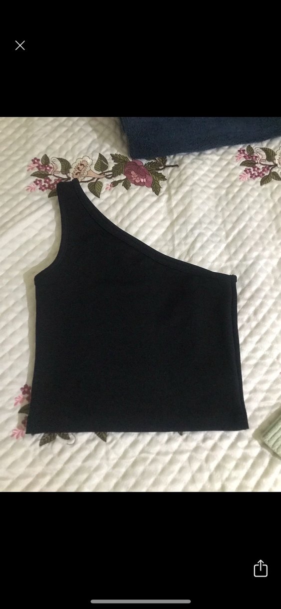 Tek omuz askılı, kolsuz, siyah crop top. Düz synthetic kumaştan, kısa ve vücuda oturan kesim. Minimalist sokak tarzı için uygun.