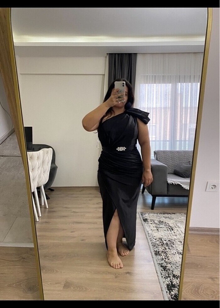 Tek omuz siyah kemer detaylı abiye elbise