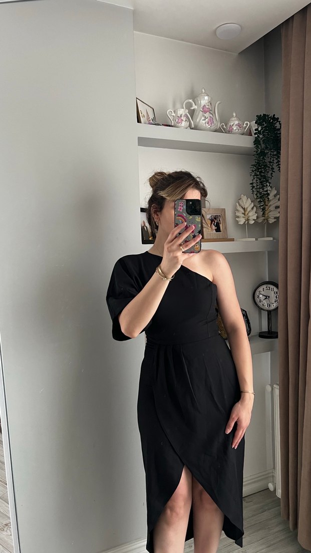 Tek omuzlu, siyah midi elbise, gevşek kesimi ve ince askılı tek kol detayıyla romantik akşamlar için zahmetsiz şıklık sunar. Çağdaş ve modaya uygun.
