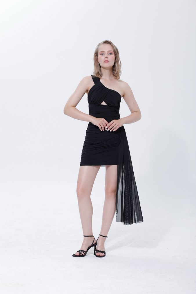 Zamansız siyah tonu ve tek omuz kesimiyle sofistike bir görünüm sunar. Tül dokusu hafif ve zarif bir siluet oluştururken iddialı tasarımıyla gece şıklığında öne çıkar. Özel davetler ve şık akşamlar için dikkat çekici bir tercih. Manken boyu: 175 cm Ürün bedeni: S Mevcut bedenler: S – M – L