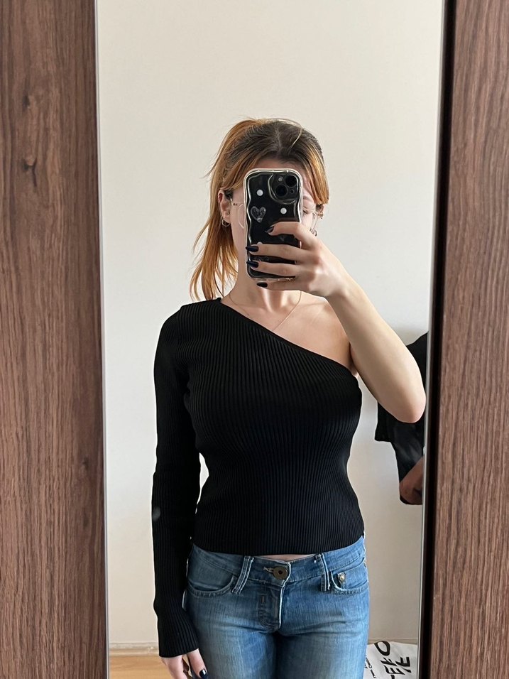 Tek omuzlu, uzun kollu siyah denim bluz. Günlük kullanıma uygun, rahat ve şık bir sokak stili parçası.