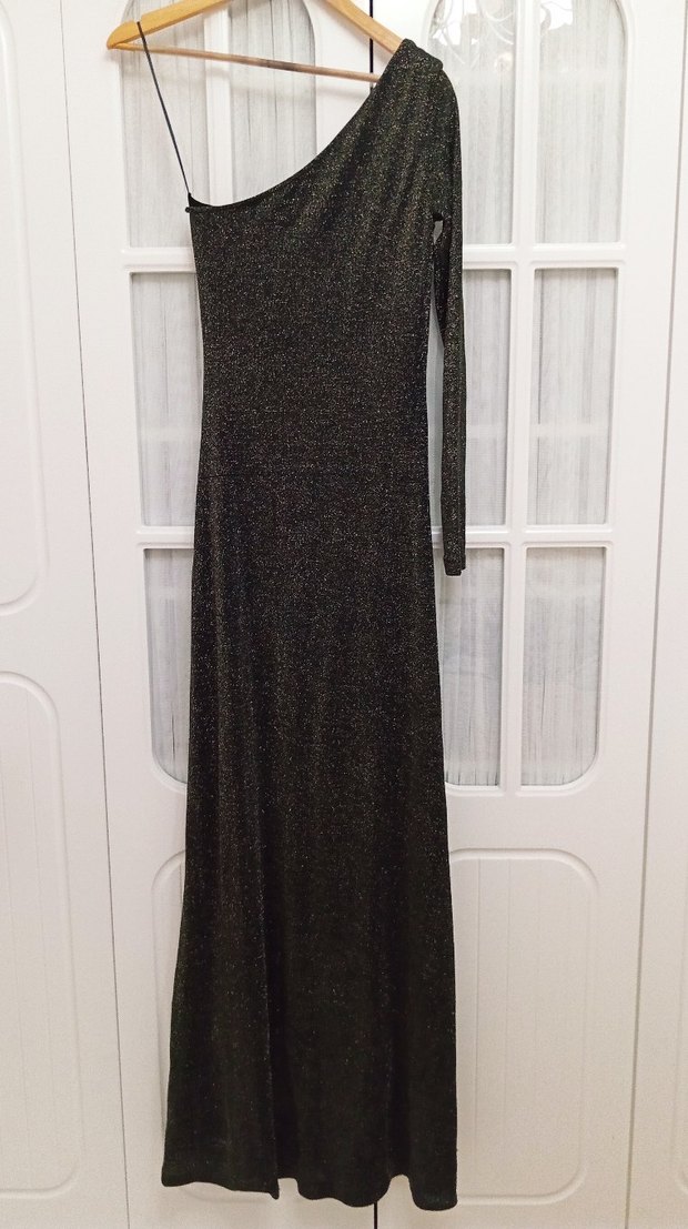 Twist tek omuz uzun siyah üzerine Gold sim geçişli elbise.bir kolu uzun kollu, şık ve göz alıcı parti düğün özel gün elbisesi.tertemiz ✨kol altı en 38 bel 33 omuzdan boy 160cm.likralı s-m bedene uygun.1 defa kullandım başka yerde kullanamayacağım için ilanda