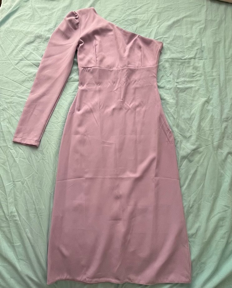 Tek omuz yırtmaçlı lila elbise askıda durduğu için kırışıklıkları var hiç giyilmedi ama etiketi yok