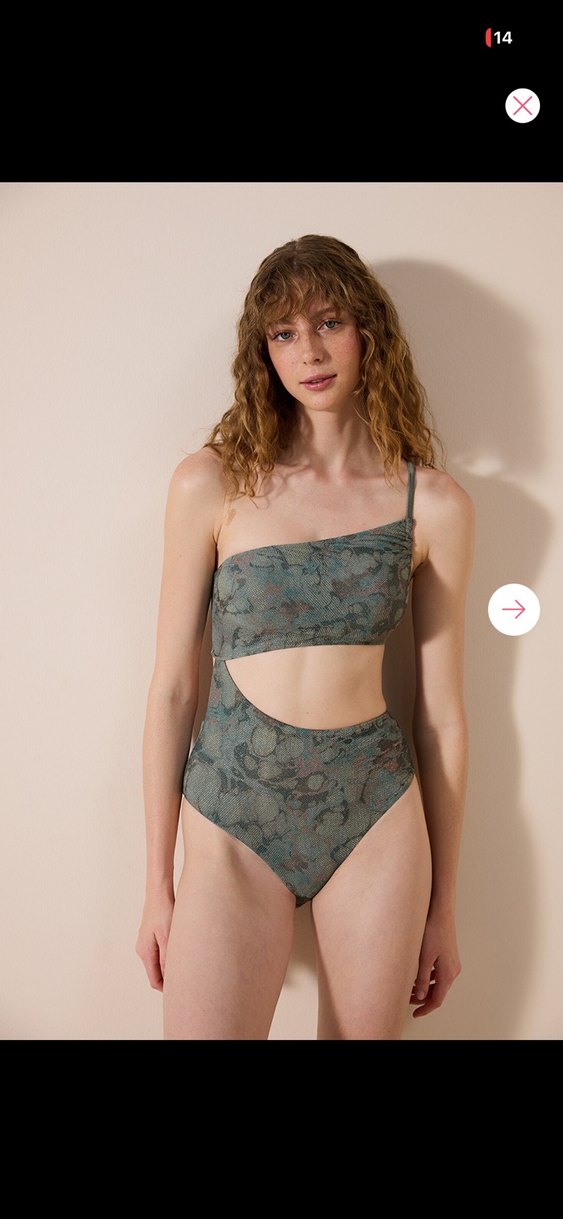 Tek omuzlu askılı, batik desenli, kısa kesim ve vücuda oturan kadın mayo, plaj için ideal.