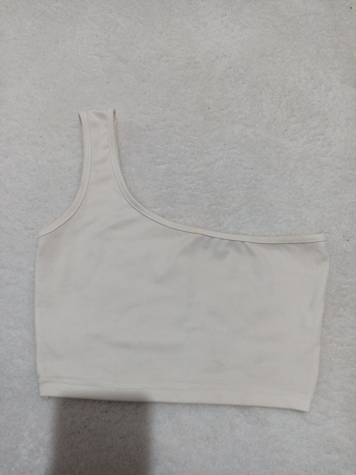 Bu beyaz crop top, tek omuz askılı, vücuda oturan ve yumuşak sentetik kumaştan yapılmış sade bir tasarıma sahiptir. Spor veya günlük kullanım için uygundur. ⚡