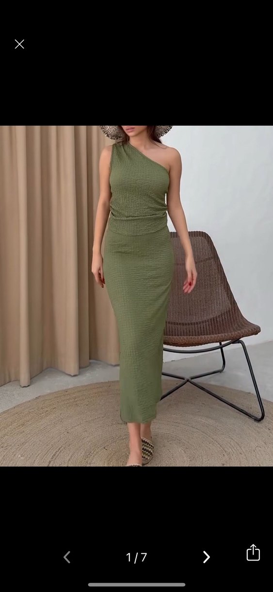 Tek omuzlu, drapeli ve düz renkli bu haki uzun elbise, yumuşak sentetik kumaştan yapılmıştır ve rahat bir kesime sahiptir.
