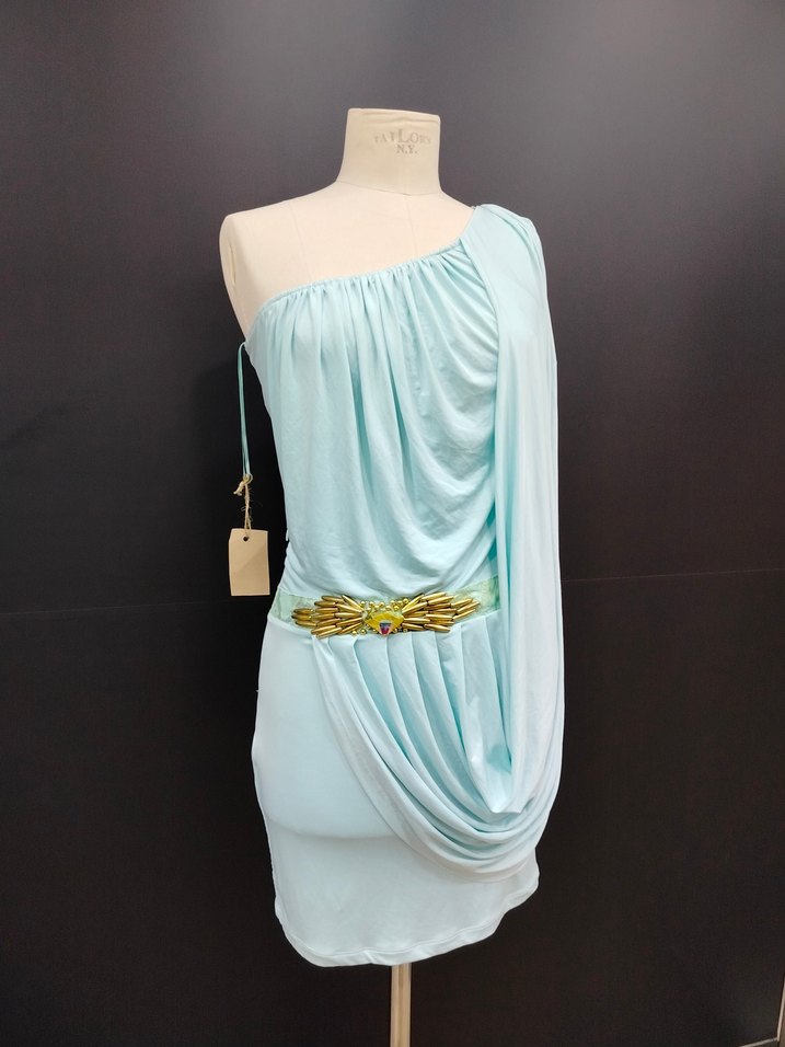 Tek omuzlu, drapeli ve bol kesim turkuaz mini elbise, altın detaylı kemerle mezuniyet ve parti için uygundur.