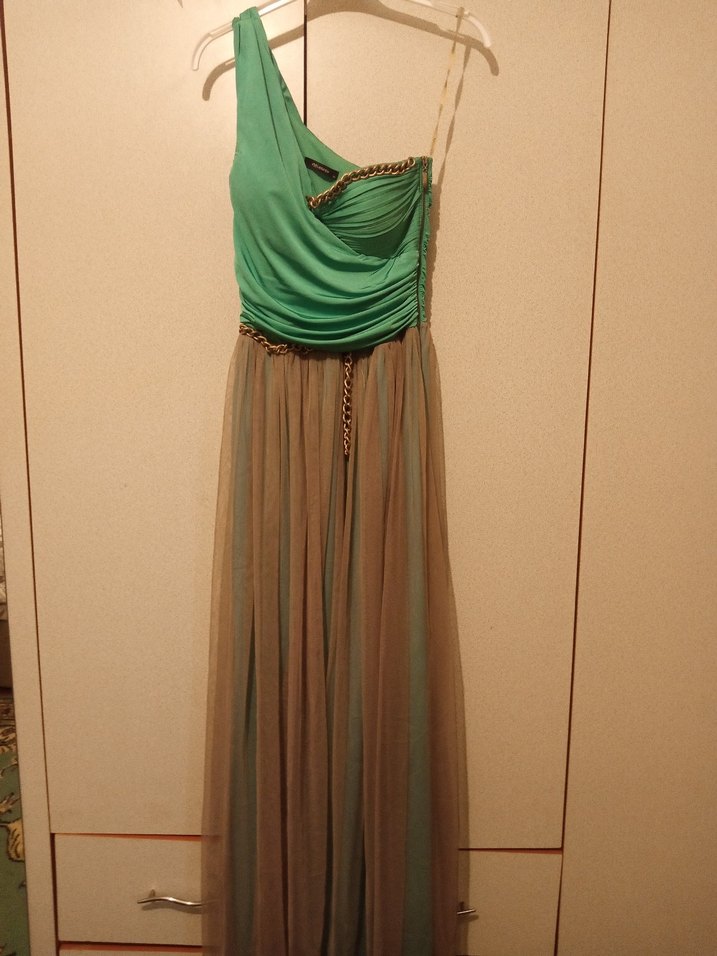 Tek omuzlu, drapeli ve vücuda oturan uzun abiye elbise. Pastel bej ve yeşil tonlarında, düğün ve özel günler için uygun.