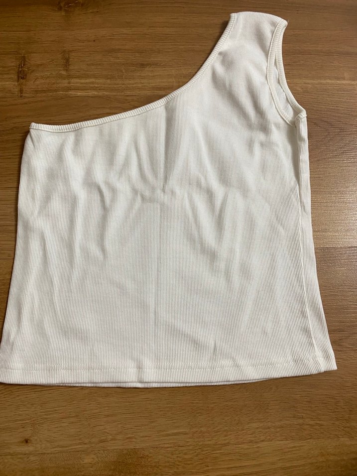 Beyaz renkli, tek omuzlu ve kolsuz kadın crop. İkili takım olarak almıştım ama siyahını kaybettim beyazı tek olarak giymeyi tercih etmiyorum o yüzden 1 kere giyildi