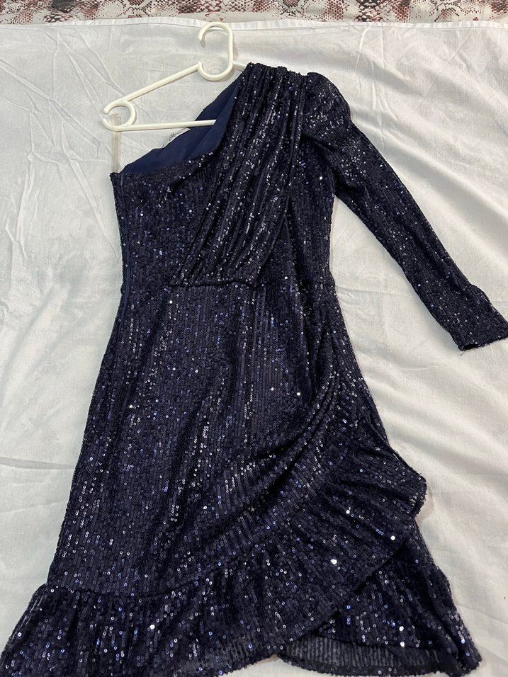 Tek omuzlu, uzun ve dar kesim lacivert payetli abiye elbise, tek uzun kollu ve drapeli tasarımıyla göz alıcıdır. Parti için uygundur.✨