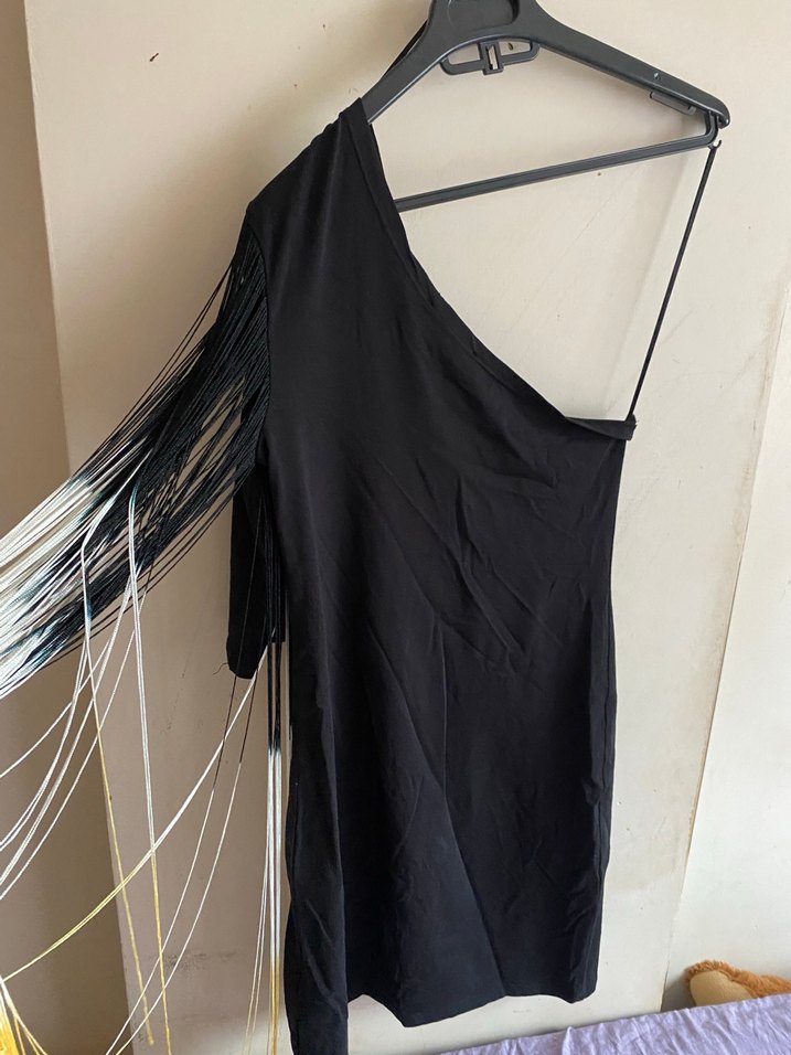 Tek Omuzlu Püsküllü Siyah Uzun Elbise