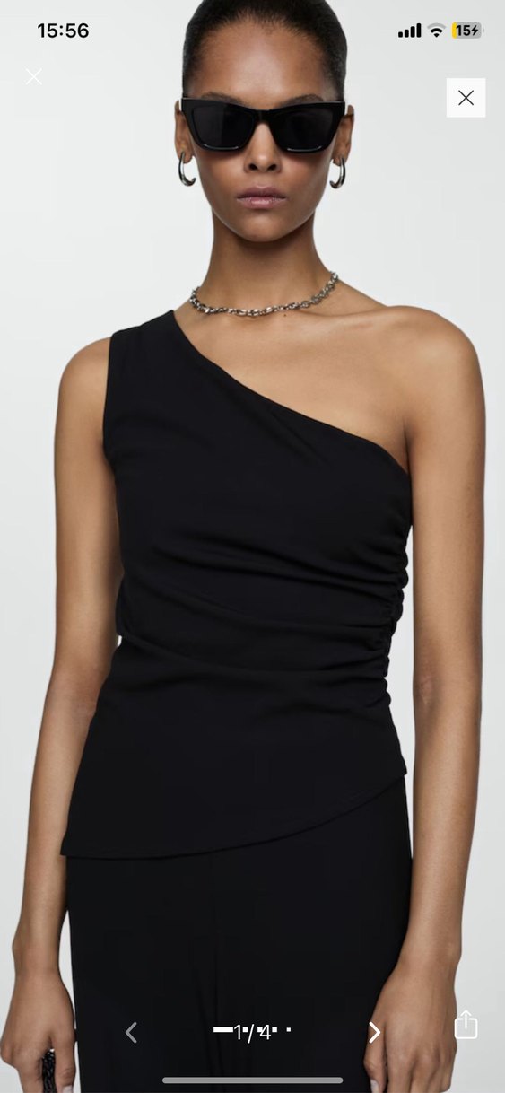 Bu siyah mini bluz, tek omuzlu, drapeli bir model.