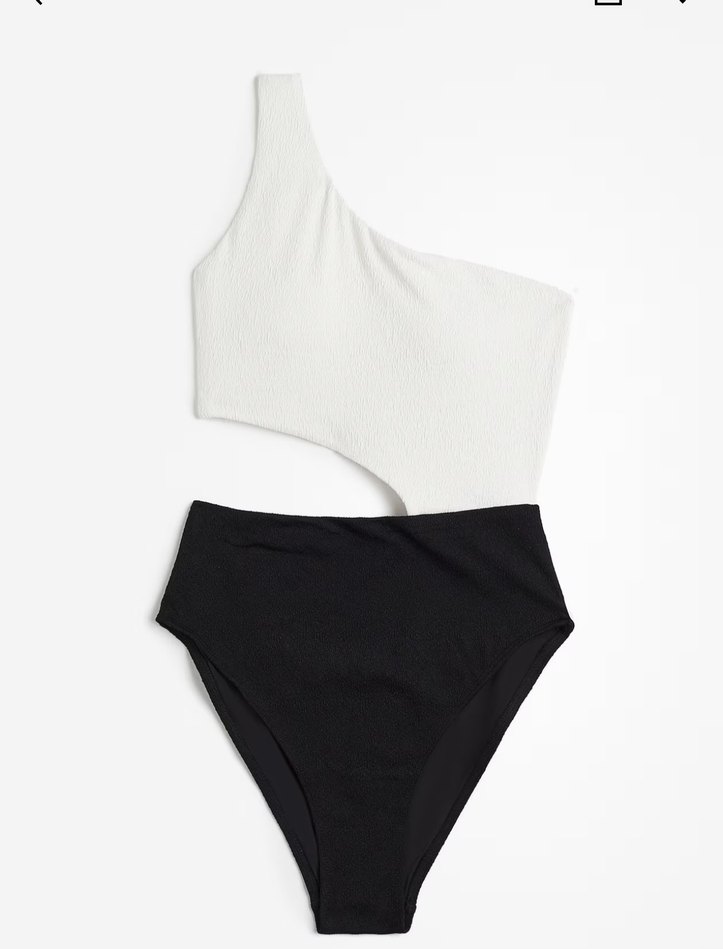 Tek omuzlu beyaz üst ve yüksek bel siyah alt parçalı, vücuda oturan modern ve minimalist mayo. Sahilde rahat ve şık bir görünüm sunar. ️