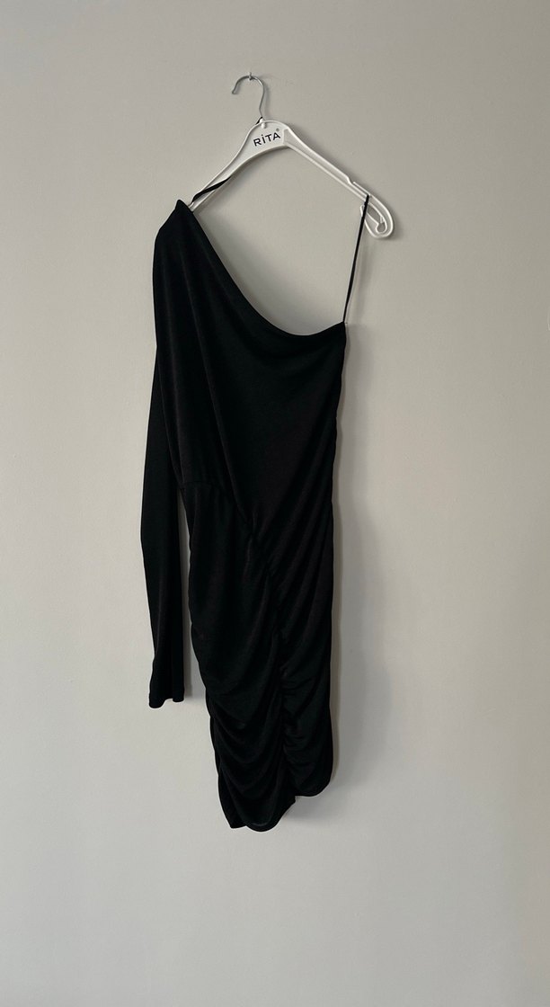 Tek omuzlu ve drapeli tasarıma sahip, siyah, uzun, vücuda oturan abiye elbise. Minimalist gotik stil, romantik akşamlar için uygun.