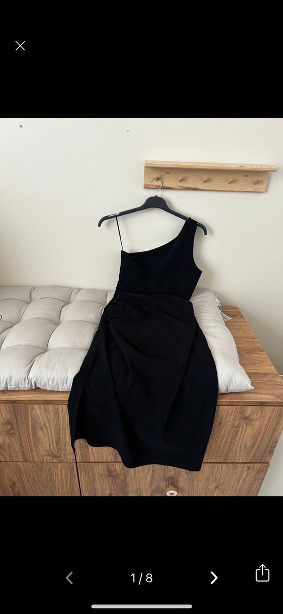 Tek omuzlu askılı, drapeli siyah elbise. Straplez yaka ve dar kesimiyle romantik akşamlar için şık bir seçim. Defosuz ihtiyaç fazlası