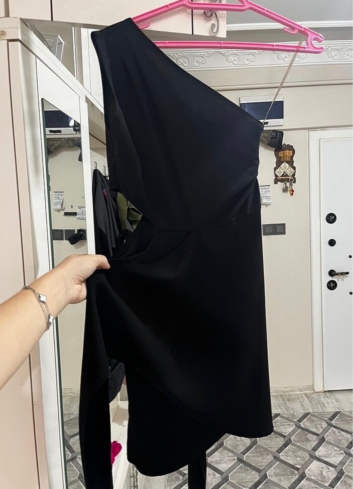 Tek omuzlu, straplez siyah midi abiye elbise, bir gün evlenme teklifinde giyildi