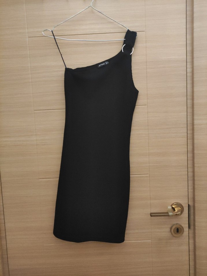 Tek omuzlu, drapeli detaylı siyah midi elbise, minimal ve şık bir görünüm sunar.