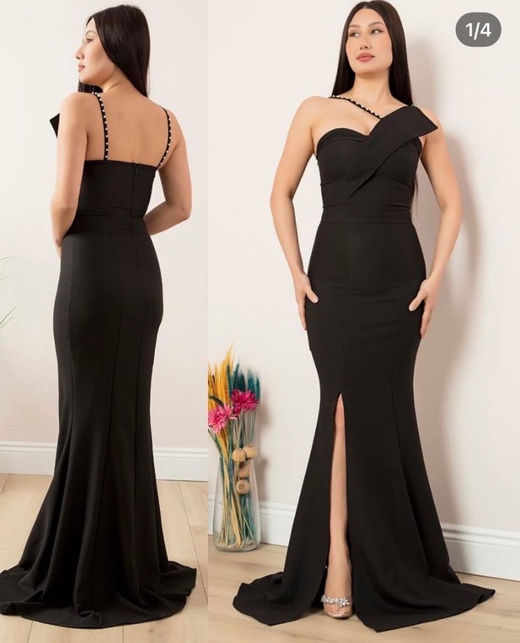 Bu siyah uzun abiye elbise, tek omuz drapeli ve straplez kesimiyle romantik akşamlar için şık bir seçimdir. ✨