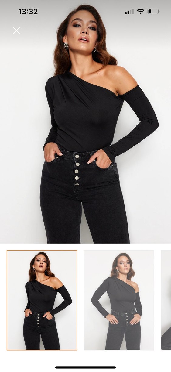 Tek omuzlu ve uzun kollu, yumuşak denim görünümlü kumaştan yapılmış, siyah ve dar kesim bluz.