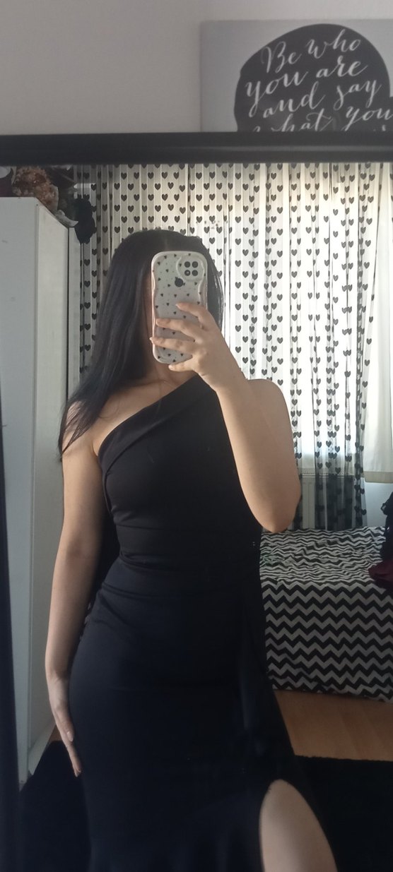 Bu siyah balik uzun abiye tek omuzlu çok güzel vücudu sarıyor s-m bedene olur düğün icin aldım iki kez giydim yeni