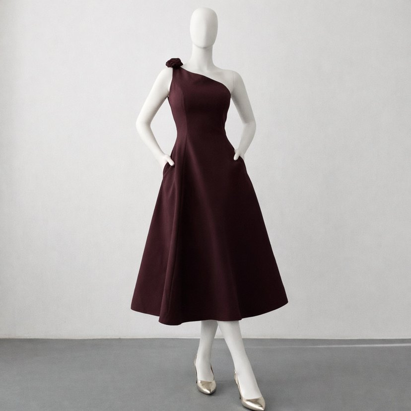 Yeni sezon kahverengi tek omuz gül detaylı kloş etekli kumaşı çok kaliteli harika midi boy elbise tek devamı yok iç dış etiket kesik