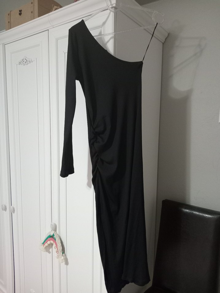 Uzun, siyah ve vücuda oturan bu elbise tek omuzlu ve straplez yaka ile uzun kolludur. İpeksi kumaştan yapılmış, romantik gece için gotik tarzda drapeli tasarıma sahiptir.