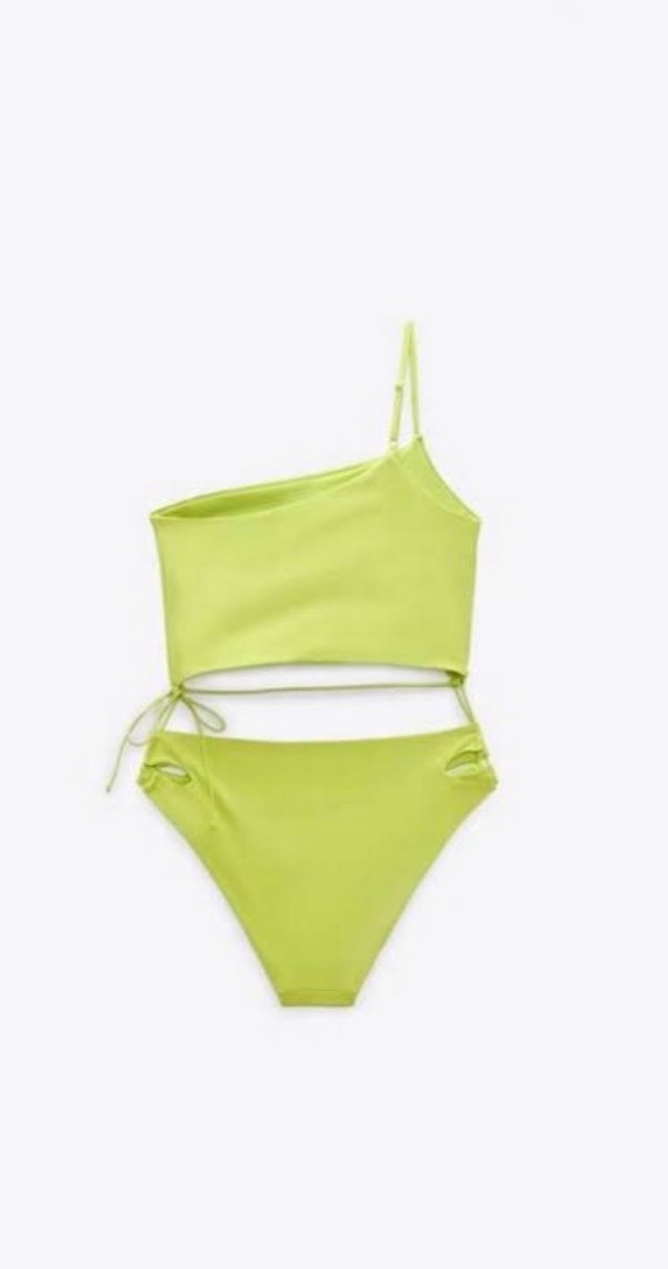 Tek omuzlu askılı, hafif yeşil renkli, kısa kesim ve vücuda oturan kadın mayosu. Minimalist tarzda, rahat ve şık bir seçim.