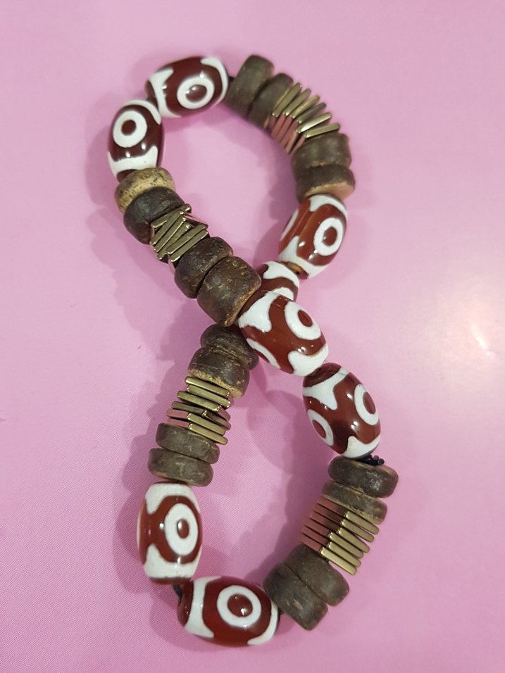 sandal ağacı, hematit ve cam boncuklardan yapılmış, lastikli erkek/unisex bileklik. bohem ve spor. özel bir tasarım. duran çap 6.1 cm. hiç kullanılmadı. (koç burcuna atfedilen hematit, stress azaltma ve hafızayı güçlendirme özellikleri ile tanımlanır.)