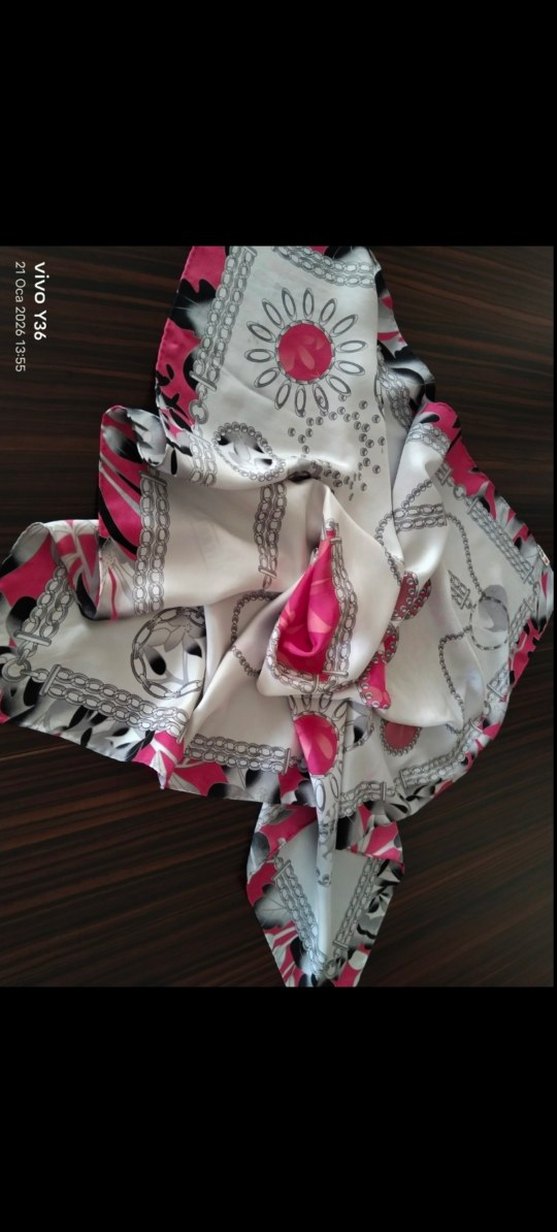 TEKBİR %100 İPEK EŞARP. Açik gri zemin üzerine desenlidir Hiç kullanılmadı ama son fotoda görünen pembelik desenmi bilmiyorum o yüzden fiyatı uygun.88 X 87 cm