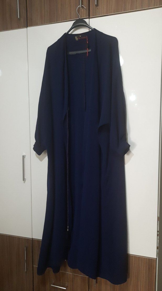 Lacivert renkte, uzun kollu ve salaş kesim kadın elbisesi. Minimalist tarzda, desensiz ve rahat bir modeldir. 48-50-52 beden aralığı rahatlıkla olur belinde ipli iki adet püsküllü kuşağı var püsküllerinden biri ben alınca da yoktu.o yüzden fiyati uygun tuttum. bunun dışında defosu lekesi yoktur kumaşı tiril tiril çok güzel kaliteli.