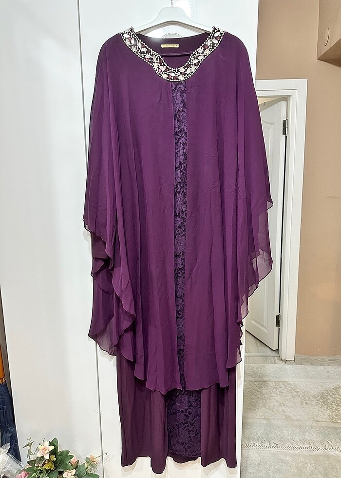 Ürün 1 defa giyildi hiçbir kusuru bulunmamaktadır. Tekbir marka ürün 48 bedendir. Ön kısmı dantel detaylı yaka kısmı taşlı pelerinli birleşik takımdır. Uzun süre giyilmediği için dolapta kırışmış sadece ufak bir ütü gerektirir. Ürün mürdüm rengidir. Çok şık bir model alana hayırlı olsun