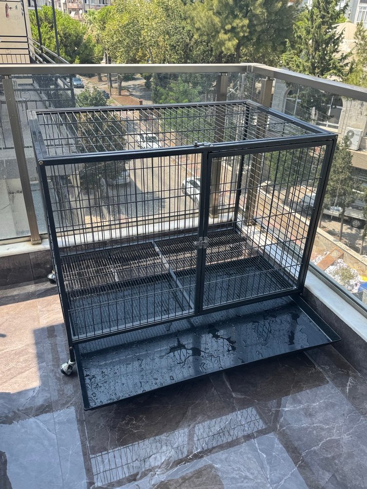 Tekerlekli ve çıkarılabilir tabakalı dayanıklı gri metal köpek kafesi. 4 ay kadar kullanıldı,çiziği ve deformesi yoktur.İzmir içi elden teslim olabilir