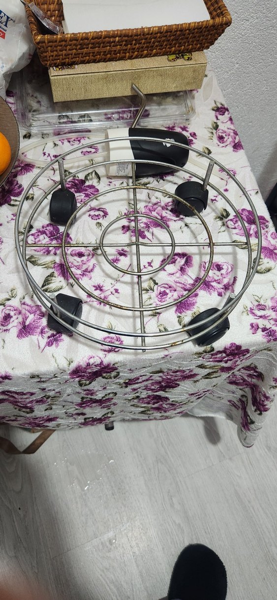 Tekerlekli ve metalden yapılmış yuvarlak damacana altlığı, mutfak zemini korur.