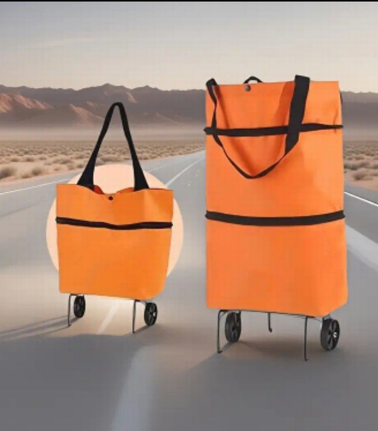 Turuncu renkli, tekerlekli pazar çantasıdır. Eşyalarınızı taşımak için kullanışlıdır. Pazar çantası büyüyen ve küçülen
