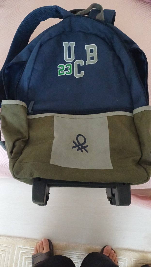 Tekerlekli, yeşil ve gri renkte çocuk okul sırt çantası. Üzerinde "23" ve "U.B" baskıları bulunur.