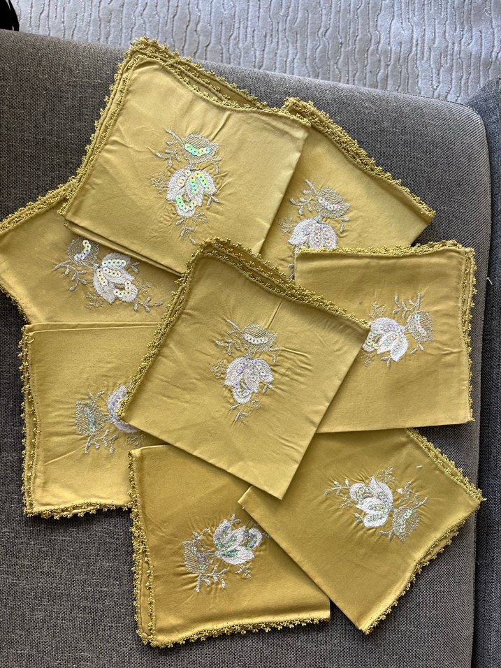 ▶️İster hobi değerlendirmelerinizde isterseniz misafir vitrin mutfak peçetesi olarak kullanılabilir. Pico nakışlıdır kenarları iğne oyası sekiz adet mevcut belirtilen fiyat tekli fiyatıdır ▶️işlemeden kaynaklı büzgülenmeler mevcuttur. ▶️haki kumaşa,beyaz-gümüş işlemeli çiçek desenli ve oyalı kenarlara sahip geleneksel misafir örtüsü takımı.
