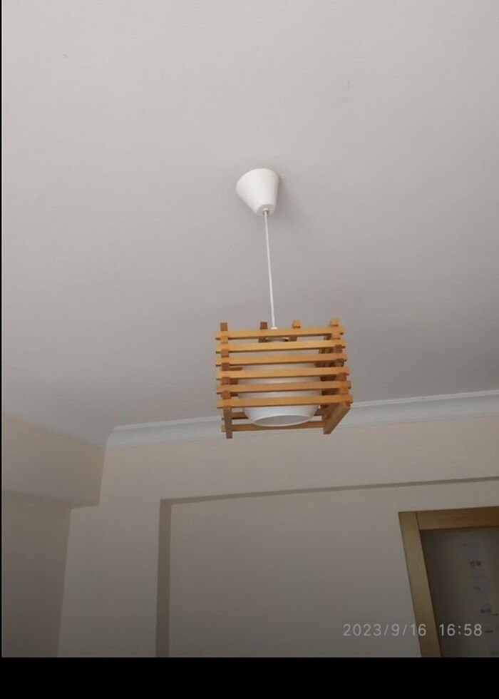 Tekli sarkıt avize. Ahşap kenarlıklı oldukça şık avize. Marka temsilidir.