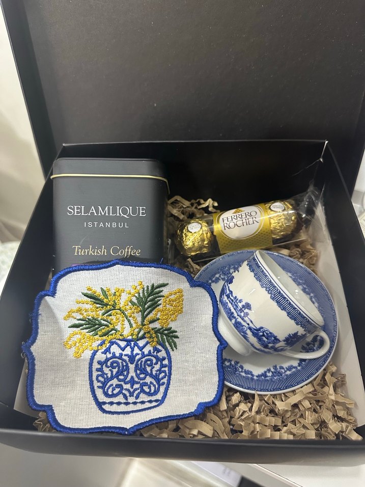 Mavi beyaz modern klasik Türk kahvesi fincanı ve tabağı, işlemeli çiçek desenli bardak altlığı, Selamlique Istanbul Türk kahvesi kutusu ve Ferrero Rocher çikolataları içerir. ☕