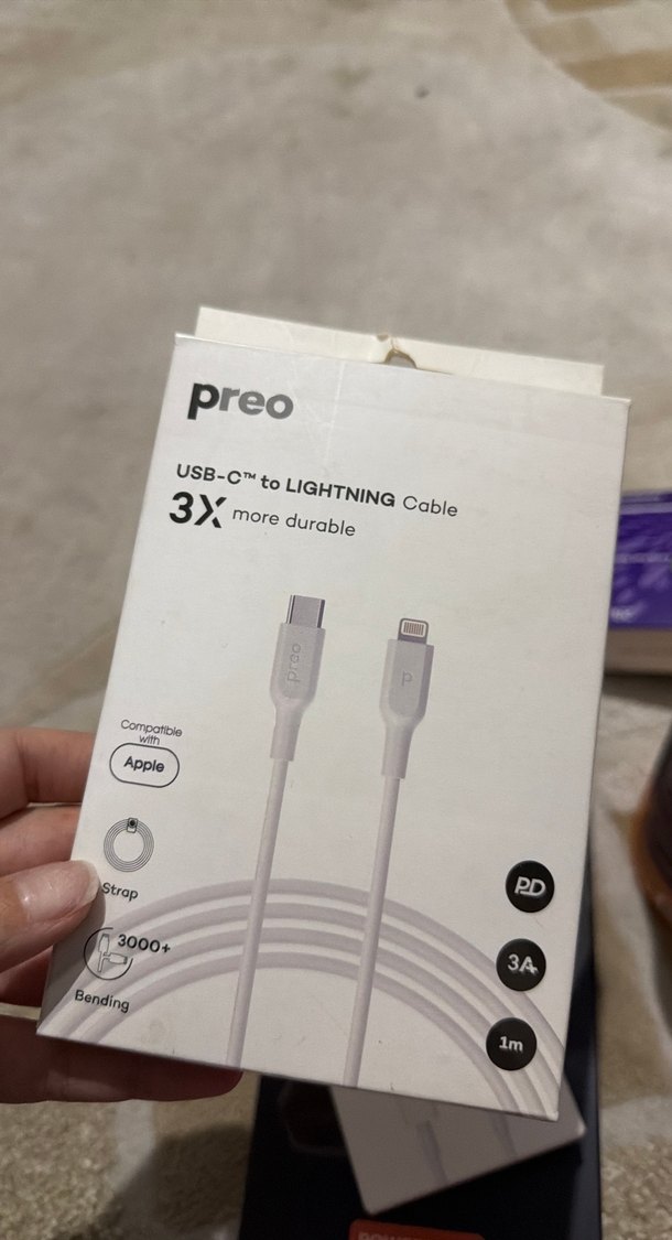 Preo USB-C to Lightning kablo, 3 kat daha dayanıklı, 3A ve PD hızlı şarj destekli, 1 metre uzunluğunda beyaz renkte. ⚡
