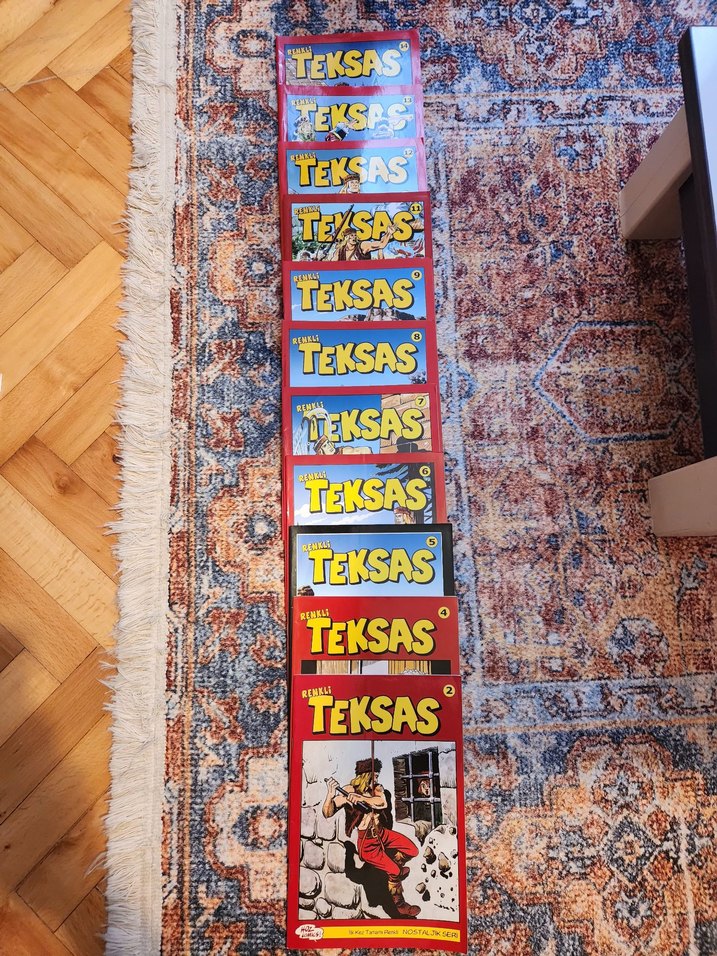 Klasik western temalı kapaklara sahip 10 adet Teksas çizgi roman seti, halı üzerinde sıralanmış.