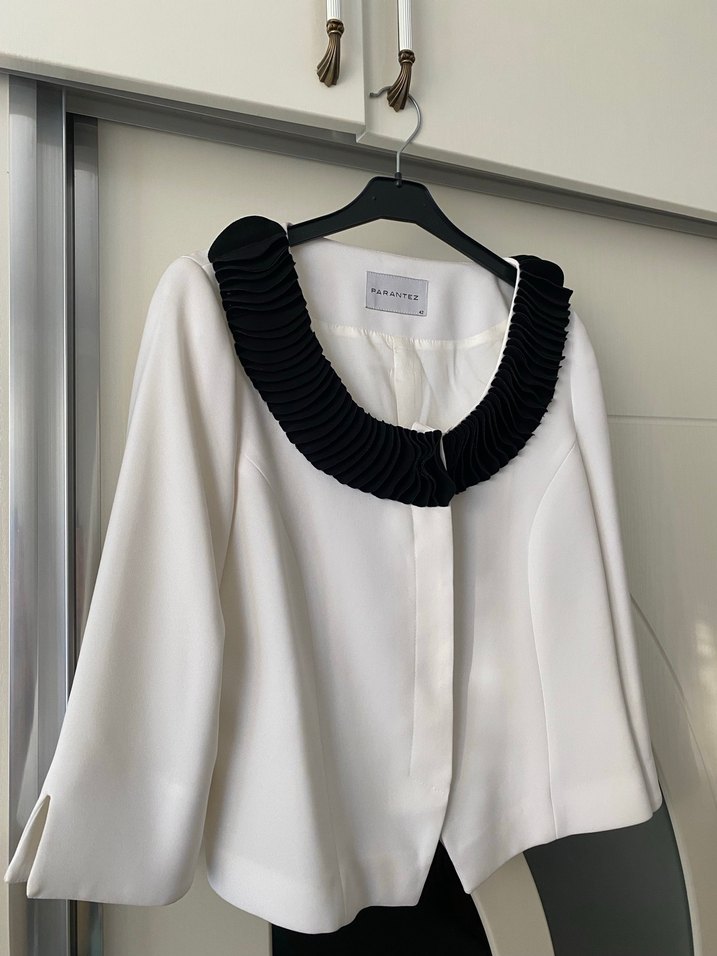 Tekstilden yapılmış, siyah pileli yakalı beyaz, uzun kollu, regular fit kadın ceket. Ofis için çağdaş bir stile sahiptir. Şık ve kurtarıcı bir parça.